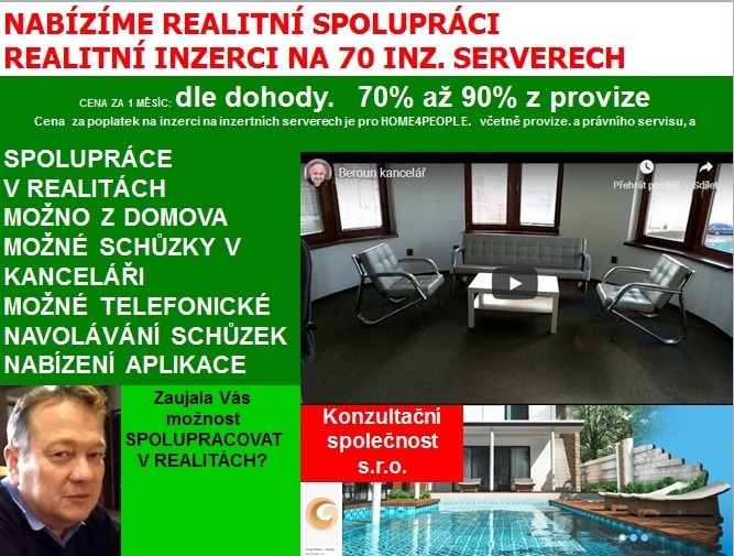 Nabízíme: Podílení se na 2 spolu propojených aktivitách, na realitní spolupráci, na developerské spolupráci a revolučním online projektu s aplikací do telefonu, zajímavý příjem, flexibilní pracovní dobu, motivující systém, možnost profesního i finančního růstu, online školení zdarma.Podpora: Nabízíme v případě spolupráce zdarma, zaškolení, inzertní podpora, telefonické navolávání schůzek u klientů prodáváních své nemovitosti, zajímavou aplikaci do telefonu a pod. přístup k databázi prodávajících. Přístup k dřívějším klientům investorům pro jejich oslovení. Tým tipařek zasílajících SMS zprávy na prodávanou nemovitost. 70% až 90% z provizí. Vyšší provize z uskutečněného obchodního případu.