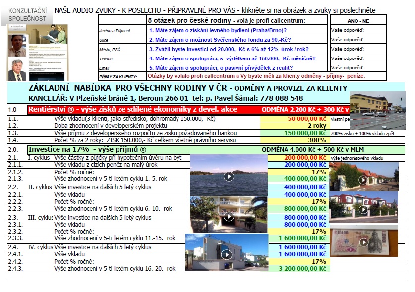 19. Hodily by se Vám meziprovize z lidí pod sebou po 300,- Kč, 500,- Kč, 200,- Kč, 300,-Kč a 7.500,- Kč za každého klienta rentiérství, na investice, na měsíční spoření, na generování peněz a na byt, kterého by sehnalo callcentrum, dostalo by zaplaceno a ještě byste dostali meziprovize Vy?