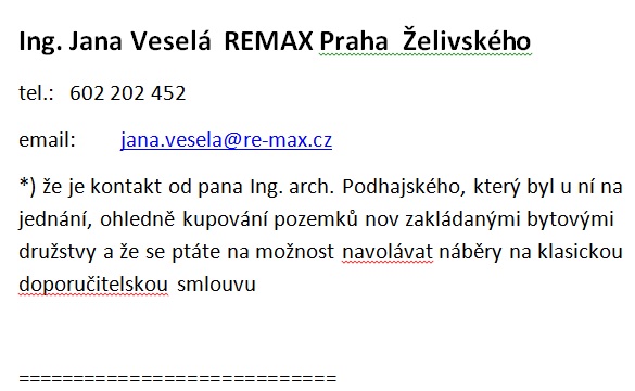 *) že je kontakt od pana Ing. arch. Podhajského, který byl u ní na jednání, ohledně kupování pozemků nov zakládanými bytovými družstvy a že se ptáte na možnost navolávat náběry na klasickou doporučitelskou smlouvu