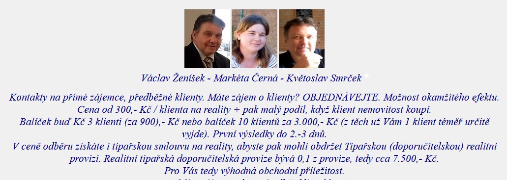 2. Máte zájem si koupit kontakt na tohoto klienta (dole uveďte jeho jméno a jeho číslo ID). Klienta si předáváte k dopracování spolupracujícím finančním poradcům a našim realitním spolupracovníkům na klientský servis. S nárokem na realitní meziprovizi za klienta, kdyby vyšel, ve výši 7.500,- Kč? Tedy za cenu 300,- Kč?