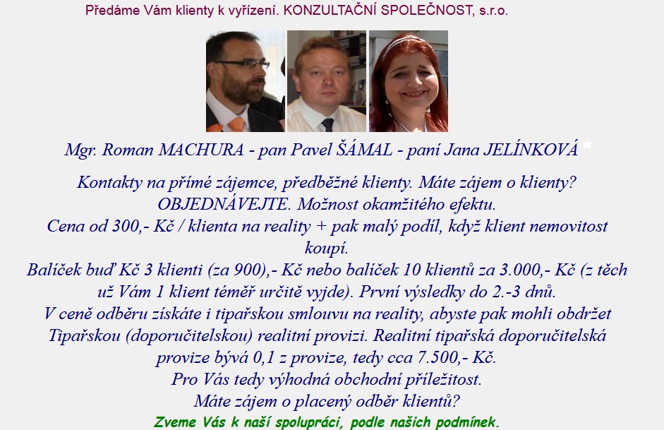 1. Máte zájem si koupit kontakt na tohoto klienta (dole uveďte jeho jméno a jeho číslo ID). Klienta si převezmete k dopracování kjako finanční poradce na finanční poradenství za účelem nabídnout klientu hypoteční úvěry a úvěry od stavebních spořitelen. Za finanční zprostředkování úvěrů obdržíte svoji provizi1 a tento obchod je s nárokem na realitní meziprovizi za klienta, kdyby vyšel, tedy provizi2 ve výši 7.500,- K. Máte o tento obchod zájem a chcete si tímto objednat koupi kontaktu na tohoto klienta za cenu 300,- Kč?