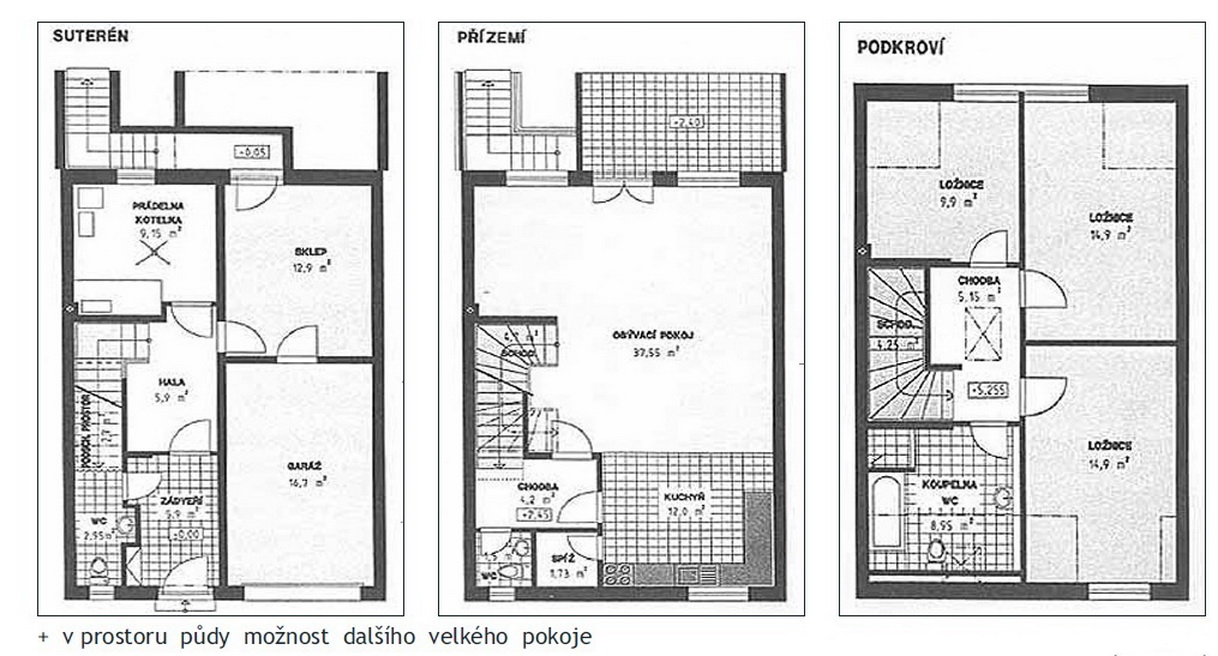 Celkem 3 podlaží. 2 nadzemní podlaží a podkroví. V přízemí garáž a kotelna, v 1. patře kuchyň a obývací pokoj a WC a v podkroví 3 ložnice a koupelna. A možnost ještě zvýšeného malého II. podkroví. Užitná plocha 180 m2.